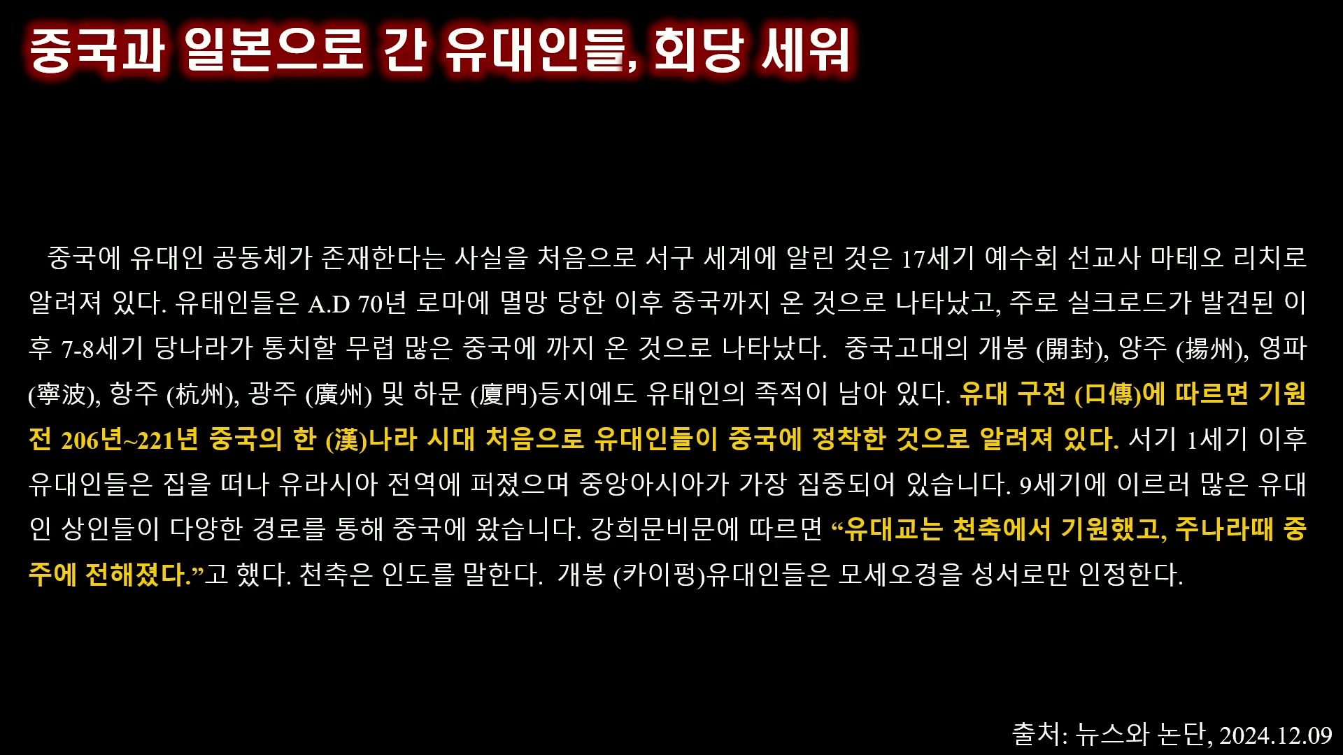 고조선의 건국 세력 중 유대인 혈통이 있었으며, 고조선 멸망 후 중국·한반도 각지로 확산.