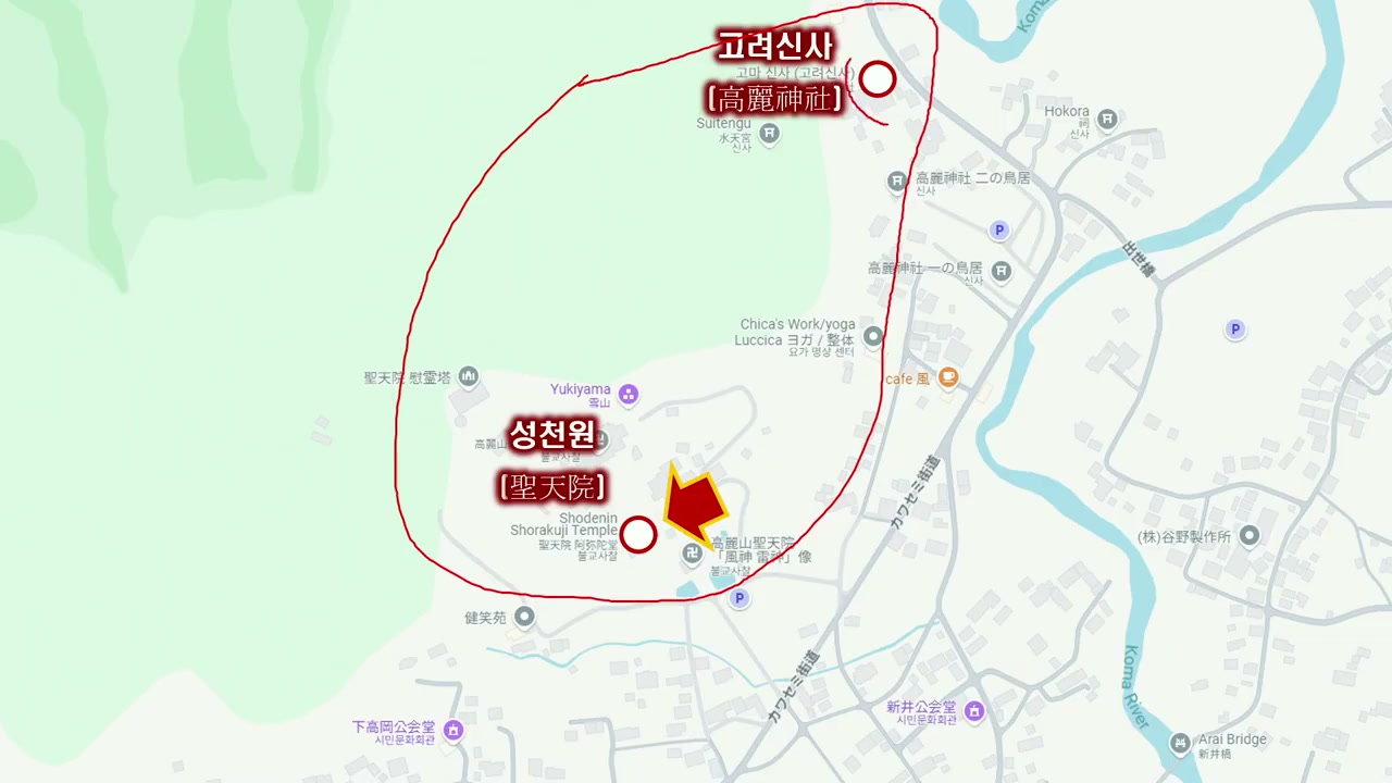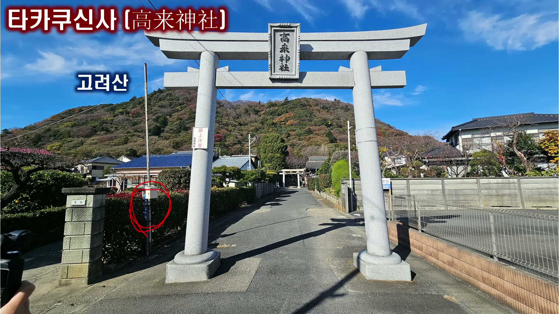 약광태자가 오이소에 최초 정착하여 다카쿠신사(원조 고려신사)를 건립하고, 이후 사이타마현으로 이주하여 현재의 고려신사를 세운 과정.