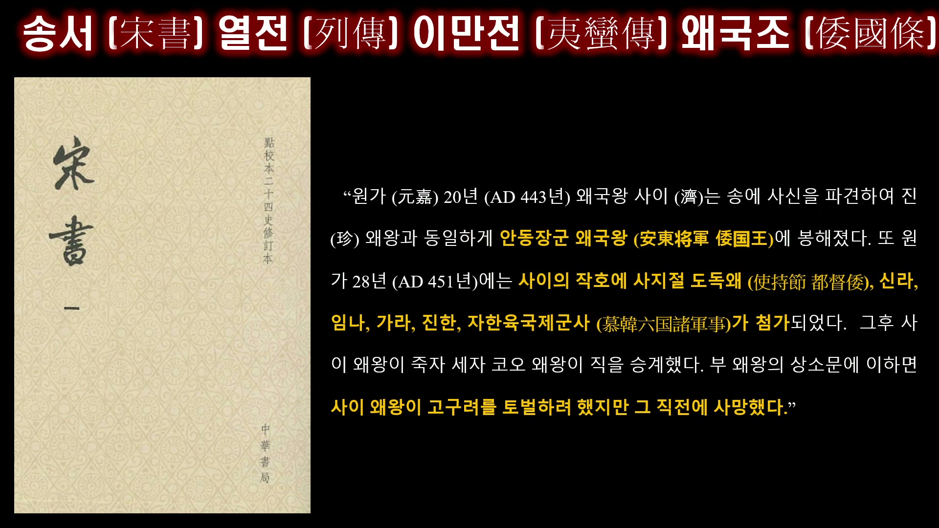 일본 천황가의 외척 세력이 백제 왕족이었다는 주장. 송서(宋書) 등 중국 사서의 왜국 관련 기록을 분석하여 백제와 왜의 긴밀한 관계를 추적하는 강의.